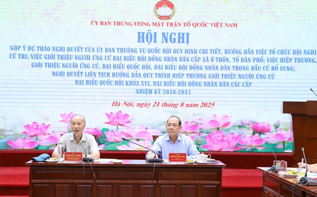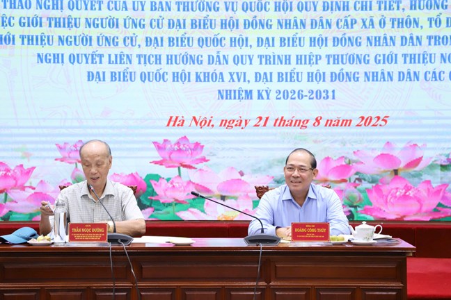 Phó Chủ tịch Hoàng Công Thủy đề nghị bộ phận thường trực Tổ biên tập xây dựng 2 dự thảo Nghị quyết rà soát kỹ lưỡng các văn bản, nghiên cứu, tiếp thu tối đa các ý kiến góp ý tại hội nghị để hoàn thiện các dự thảo Nghị quyết, bảo đảm hướng dẫn cụ thể, đầy đủ các bước trong quy trình hiệp thương, giới thiệu người ứng cử, bảo đảm việc hiệp thương lựa chọn, giới thiệu người ứng cử được khách quan, dân chủ, đúng pháp luật và bảo đảm chất lượng của đại biểu Quốc hội, đại biểu HĐND; Hướng dẫn cụ thể, đầy đủ các quy định về việc tổ chức hội nghị cử tri; giới thiệu người ứng cử đại biểu Hội đồng nhân dân cấp xã ở thôn, tổ dân phố; hiệp thương, giới thiệu người ứng cử đại biểu, lập danh sách người ứng cử đại biểu Quốc hội, đại biểu Hội đồng nhân dân trong bầu cử bổ sung của Luật Bầu cử đại biểu Quốc hội và đại biểu Hội đồng nhân dân, bảo đảm Luật được thi hành thống nhất, đồng bộ, hiệu quả.
