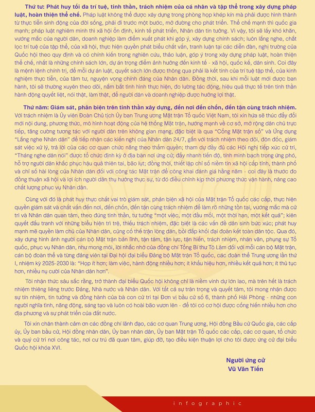 Ứng cử viên Vũ Văn Tiến cũng nêu rõ, nếu được bầu làm đại biểu Quốc hội khóa XVI sẽ góp phần xây dựng pháp luật, hoàn thiện thể chế từ thực tiễn đời sống; lấy khó khăn của người dân và doanh nghiệp làm điểm xuất phát khi góp ý chính sách; theo dõi sát việc thực thi luật, đo lường hiệu quả, hành động quyết liệt để người dân, doanh nghiệp được hưởng lợi thật.