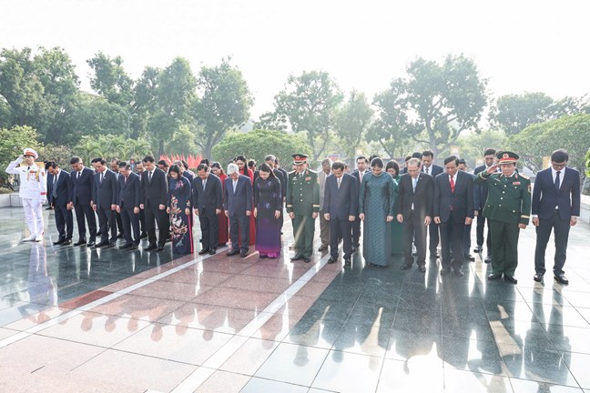 Trước anh linh các anh hùng liệt sĩ, Đoàn đại biểu dành một phút mặc niệm, bày tỏ lòng tưởng nhớ những người con ưu tú của dân tộc đã không tiếc máu xương, dũng cảm hy sinh vì sự nghiệp đấu tranh giải phóng dân tộc, vì độc lập tự do của Tổ quốc.