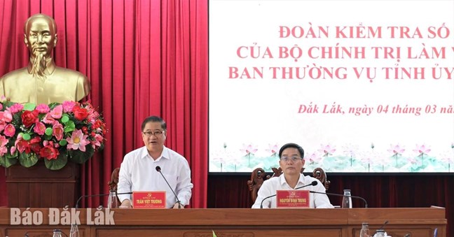Phát biểu tại buổi làm việc, đồng chí Trần Việt Trường, Phó Chủ tịch Ủy ban Trung ương MTTQ Việt Nam đánh giá cao việc Ban Thường vụ Tỉnh ủy Đắk Lắk đã bám sát đề cương theo yêu cầu của Bộ Chính trị để xây dựng báo cáo bảo đảm chất lượng, tiến độ. Đồng chí đề nghị Ban Thường vụ Tỉnh ủy Đắk Lắk quán triệt sâu sắc quan điểm chỉ đạo của Đảng, từ công tác kiểm tra của cấp trên biến thành tự kiểm tra của mình, rà soát, tự đánh giá đúng thực trạng, kết quả, những tồn tại, hạn chế, phát hiện mô hình mới, cách làm hay, nêu kiến nghị, đề xuất có trọng tâm, trọng điểm, mang tính chất chiến lược, khả thi; tiếp tục nâng cao nâng năng lực lãnh đạo, sức chiến đấu của Đảng bộ, nâng cao chất lượng công tác kiểm tra, giám sát, tránh hình thức. Với tinh thần “vừa chạy, vừa xếp hàng”, tỉnh cần gấp rút triển khai thực hiện, phân công rõ người, rõ việc, huy động, sử dụng tốt các nguồn vốn đầu tư, thường xuyên kiểm tra, giám sát nhằm hoàn thành các nội dung theo yêu cầu của Bộ Chính trị.