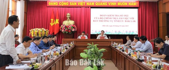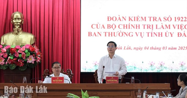 Tại buổi làm việc, đồng chí Trần Việt Trường đã công bố Quyết định số 1922-QĐNS/TW, ngày 14/2/2025 của Bộ Chính trị thành lập Đoàn kiểm tra của Bộ Chính trị, Ban Bí thư đối với Ban Thường vụ Tỉnh ủy Đắk Lắk. Theo yêu cầu của Đoàn kiểm tra số 1922, Ủy viên Ban Thường vụ Tỉnh ủy, Trưởng Ban Tổ chức Tỉnh ủy Nguyễn Thượng Hải đã báo cáo tóm tắt kết quả tổ chức thực hiện Chỉ thị số 35-CT/TW, ngày 14/6/2024 và Kết luận số 118-KL/TW, ngày 18/1/2025 của Bộ Chính trị về đại hội đảng bộ các cấp tiến tới Đại hội đại biểu toàn quốc lần thứ XIV của Đảng.