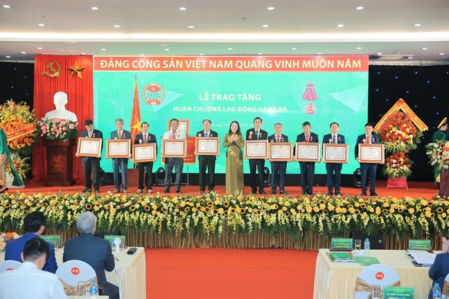 | Bà Võ Thị Ánh Xuân, Ủy viên Trung ương Đảng, Phó Chủ tịch nước CHXHVN trao Huân chương Lao động hạng Ba cho 10 cá nhân có thành tích xuất sắc của Hội Nông dân Việt Nam. |