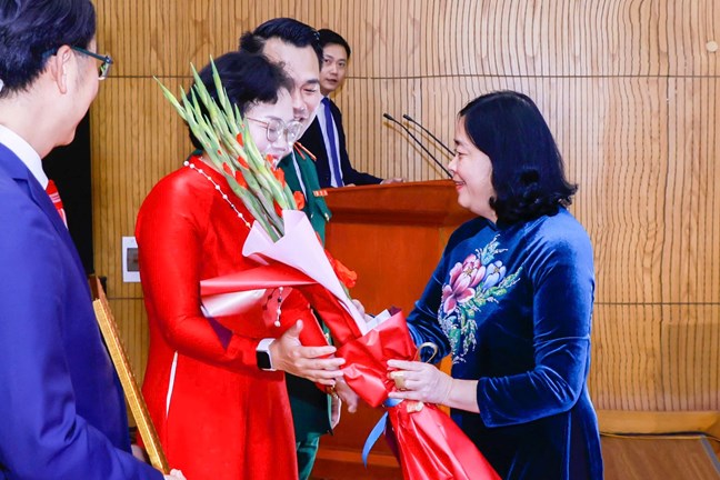 | Đồng chí Bùi Thị Minh Hoài - Chủ tịch Ủy ban Trung ương MTTQ Việt Nam trao Giải Nhất cho nhóm tác giả đoạt giải. Ảnh: Quang Vinh. |
