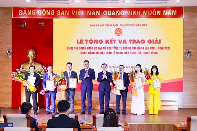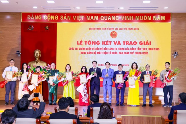 (Mặt trận) - Chiều 17/12, tại Hà Nội, Đảng bộ MTTQ, các đoàn thể Trung ương tổ chức Lễ Tổng kết và trao giải Cuộc thi chính luận về bảo vệ nền tảng tư tưởng của Đảng lần thứ I, năm 2025 trong Đảng bộ MTTQ, các đoàn thể Trung ương.