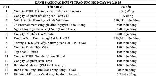Cũng trong ngày 9/10, Viện Hàn lâm Khoa học xã hội Việt Nam trao số tiền trên 670 triệu đồng; 28 Entertainment cùng gia đình Nguyễn Thảo Hương ủng hộ số tiền 500 triệu đồng; Công ty Cổ phần Eco Mobile ủng hộ số tiền 200 triệu đồng; Fandom Đom Đóm của nghệ sĩ Jack - J97 ủng hộ số tiền 199,301 triệu đồng; Trường THCS Cầu Giấy, phường Yên Hòa, TP Hà Nội ủng hộ 150 triệu đồng; Công ty Thiên Phúc Viên ủng hộ 150 triệu đồng; Tập đoàn Bitexco ủng hộ 100 triệu đồng; Công ty TNHH Wonder Union Global ủng hộ 100 triệu đồng; Công ty Cổ phần Nam Dược ủng hộ 100 triệu đồng; bà Đàm Minh Anh (DManh Beauty) ủng hộ 100 triệu đồng; Bênh viện Răng Hàm Mặt Trung ương Hà Nội ủng hộ 30 triệu đồng; hệ thống trường Mầm non Vinakids, khu đô thị Ecopark ủng hộ 5,7 triệu đồng.