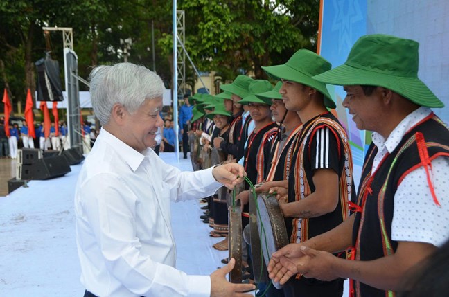 | Chủ tịch Ủy ban Trung ương Mặt trận Tổ quốc Việt Nam Đỗ Văn Chiến tặng 1 bộ cồng chiêng cho xã Nghĩa Hòa (huyện Chư Păh) |