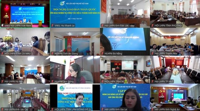 Cùng chủ trì có Phó Chủ tịch Thường trực Hội Đỗ Thị Thu Thảo; các Phó Chủ tịch Hội Nguyễn Thị Minh Hương, Trần Lan Phương, Nguyễn Thị Thu Hiền và Chủ tịch, Phó Chủ tịch Hội LHPN, lãnh đạo Ban Công tác phụ nữ của 34 tỉnh, thành phố tại các điểm cầu trên toàn quốc.