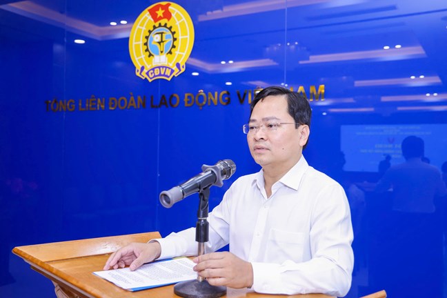 Ông Nguyễn Anh Tuấn - Ủy viên Trung ương Đảng, Chủ tịch Tổng Liên đoàn Lao động Việt Nam phát biểu tại Hội nghị