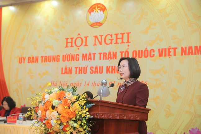 | Bà Hà Thị Nga, Uỷ viên Trung ương Đảng, Phó Bí thư Thường trực Đảng ủy MTTQ, các đoàn thể Trung ương, Phó Chủ tịch Ủy ban Trung ương MTTQ Việt Nam trình bày nội dung Tờ trình tại Hội nghị |