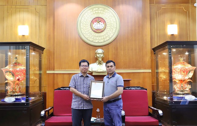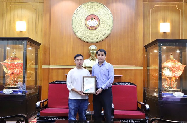 | Phó Bí thư Đảng ủy MTTQ, các đoàn thể Trung ương Ngô Văn Cương trao thư cảm ơn đại diện của Nhà thiết kế Đỗ Trịnh Hoài Nam |