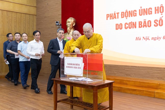 Bà Hà Thị Nga, Ủy viên Trung ương Đảng, Phó Chủ tịch Ủy ban Trung ương MTTQ Việt Nam cùng các đại biểu chung tay ủng hộ đồng bào các tỉnh, thành phố khắc phục hậu quả cơn bão số 10 gây ra