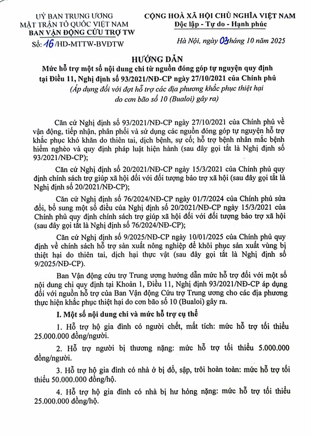 Ban Vận động cứu trợ Trung ương hướng dẫn mức hỗ trợ đối với một số nội dung chi quy định tại Khoản 1, Điều 11, Nghị định 93/2021/NĐ-CP áp dụng đối với nguồn hỗ trợ của Ban Vận động Cứu trợ Trung ương cho các địa phương thực hiện khắc phục thiệt hại do cơn bão số 10 (Bualoi) gây ra.