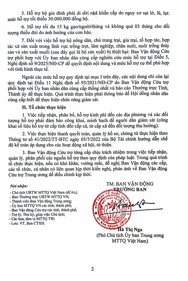 (Mặt trận) - Ngày 3/10, thay mặt Ban Vận động Cứu trợ Trung ương - Ủy ban Trung ương MTTQ Việt Nam, bà Hà Thị Nga, Ủy viên Trung ương Đảng, Phó Chủ tịch Ủy ban Trung ương MTTQ Việt Nam đã ký ban hành Hướng dẫn số 16/HD-MTTW-BVĐTW về mức hỗ trợ một số nội dung chi từ nguồn đóng góp tự nguyện quy định tại Điều 11, Nghị định số 93/2021/NĐ-CP ngày 27/10/2021 của Chính phủ (Áp dụng đối với đợt hỗ trợ các địa phương khắc phục thiệt hại do cơn bão số 10 (Bualoi) gây ra).