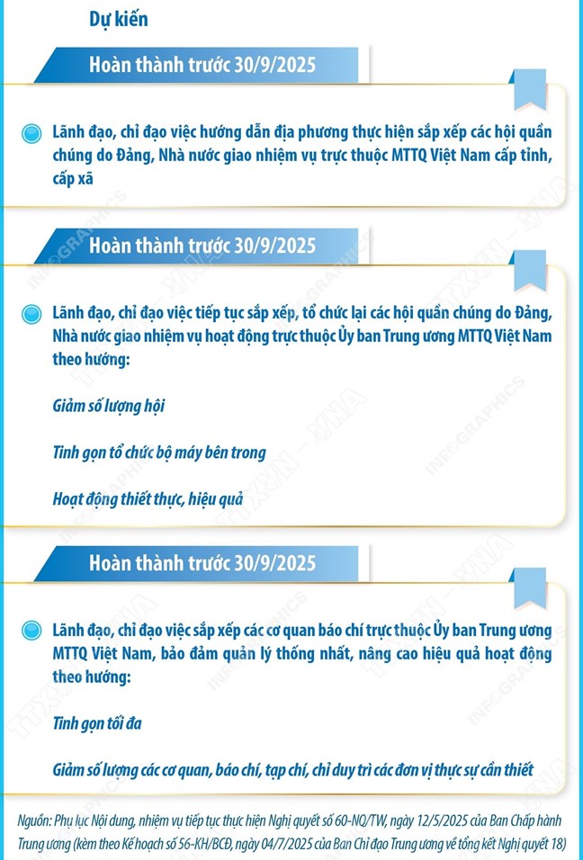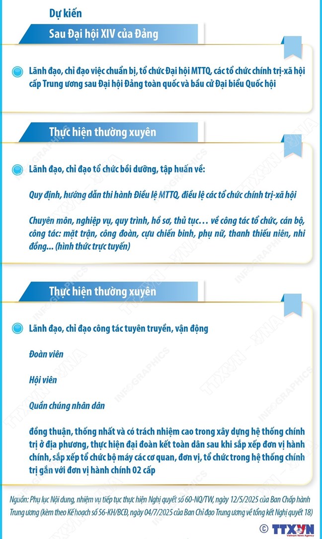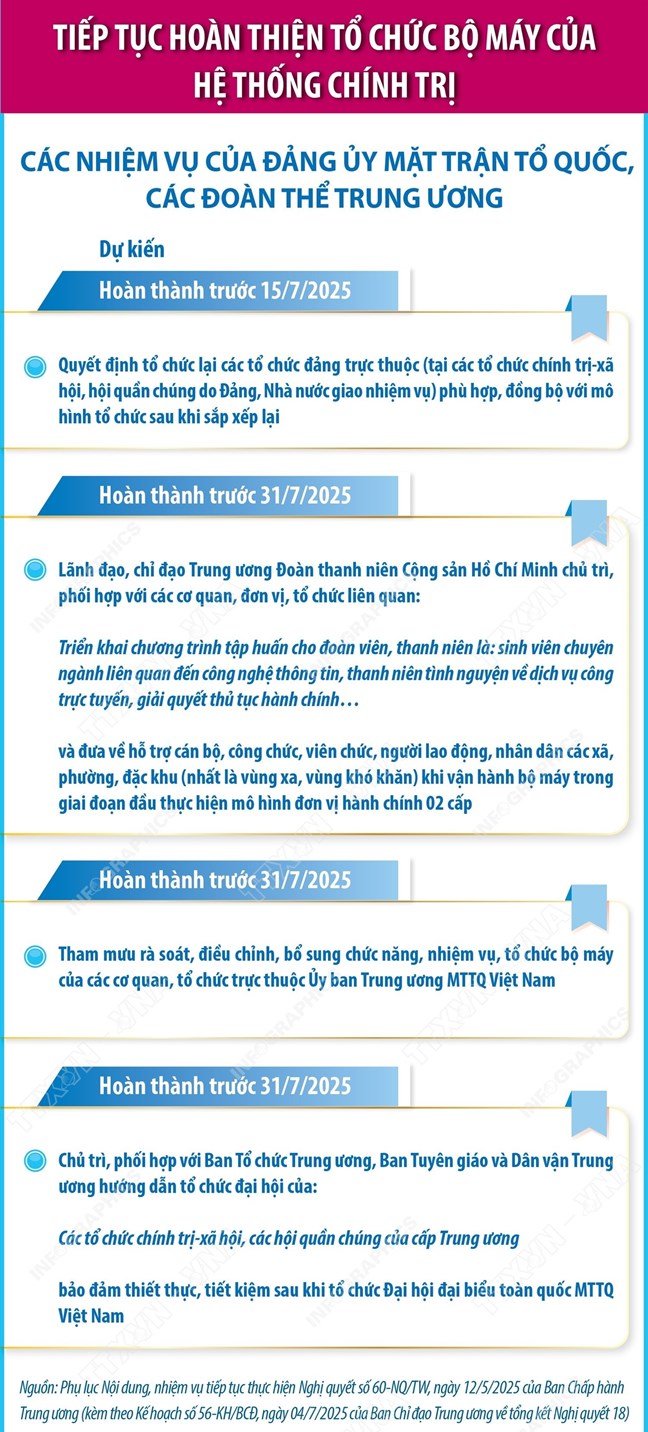 (Mặt trận) - Thực hiện Nghị quyết số 60-NQ/TW, ngày 12/4/2025 của Ban Chấp hành Trung ương Đảng khóa XIII về tiếp tục sắp xếp tổ chức bộ máy của hệ thống chính trị và các kết luận của Bộ Chính trị, Ban Bí thư; Ban Chỉ đạo Trung ương về tổng kết Nghị quyết 18 ban hành Kế hoạch 56-KH/BCĐ ngày 4/7/2025 tiếp tục hoàn thiện tổ chức bộ máy của hệ thống chính trị và chuẩn bị Đại hội đảng bộ các cấp. Sau đây là các nhiệm vụ cụ thể của Đảng ủy Mặt trận Tổ quốc, các đoàn thể Trung ương.