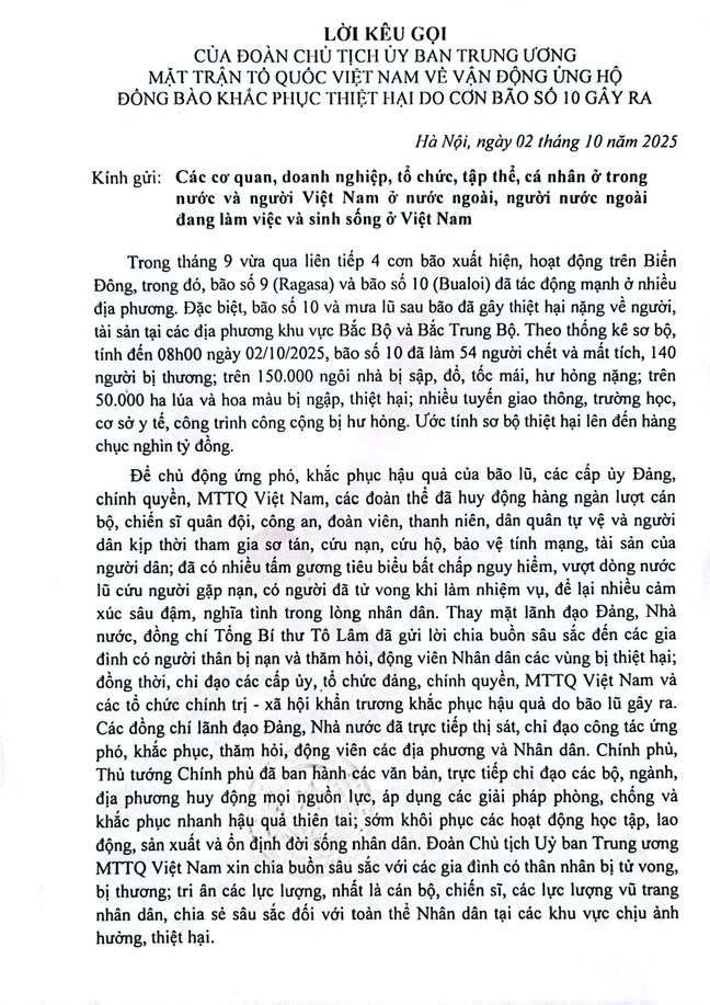 Hậu quả do bão lũ gây ra là rất lớn, nhiều hộ gia đình, cá nhân cần được hỗ trợ, giúp đỡ. Đảng và Nhà nước đã và đang triển khai các giải pháp, nguồn lực để khôi phục cơ sở hạ tầng, hỗ trợ tái sản xuất, đảm bảo đời sống của Nhân dân. Trong điều kiện nguồn ngân sách nhà nước còn hạn chế, phát huy truyền thống đoàn kết quý báu của dân tộc, với tinh thần “Tương thân tương ái”, “Lá lành đùm lá rách”; với chân lý “Nước Việt Nam là một, dân tộc Việt Nam là một”, Đoàn Chủ tịch Uỷ ban Trung ương MTTQ Việt Nam tha thiết kêu gọi đồng bào và chiến sĩ cả nước, đồng bào ta ở nước ngoài, các cơ quan, tổ chức, các doanh nghiệp, các nhà hảo tâm ở trong và ngoài nước, người nước ngoài đang sinh sống, làm việc ở Việt Nam hãy dành những tình cảm tốt đẹp, sẻ chia, giúp đỡ về tinh thần, vật chất, góp phần cùng với Đảng, Nhà nước hỗ trợ Nhân dân khắc phục thiệt hại do bão số 10 gây ra.
