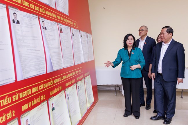 | Ủy viên Bộ Chính trị, Bí thư Trung ương Đảng, Bí thư Đảng ủy MTTQ, các đoàn thể Trung ương, Chủ tịch UBTƯ MTTQ Việt Nam Bùi Thị Minh Hoài cùng các đại biểu xem danh sách niêm yết tại trụ sở xã Lương Sơn, tỉnh Phú Thọ |