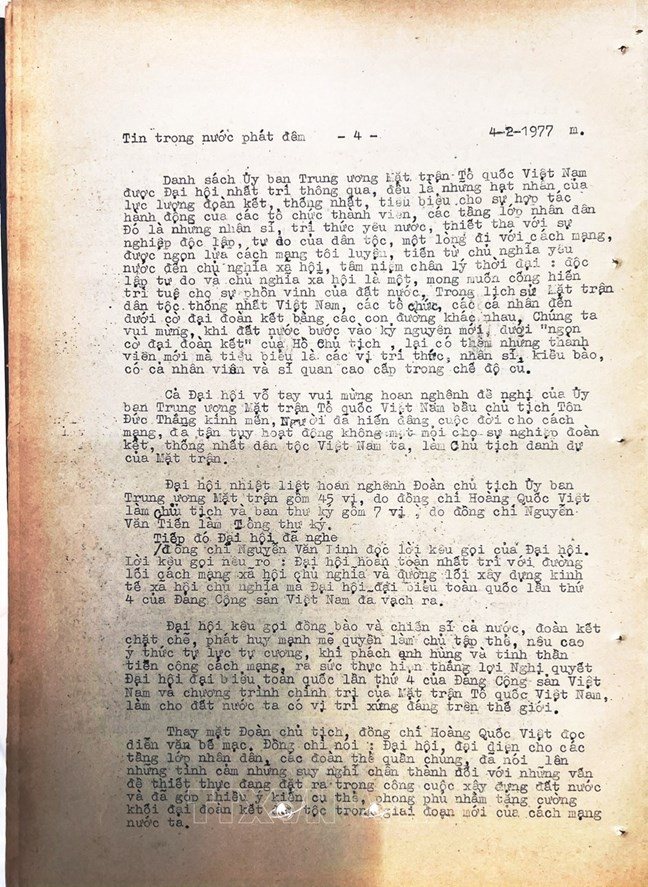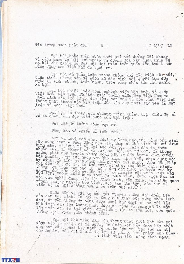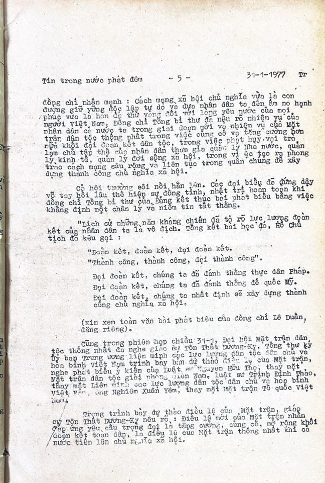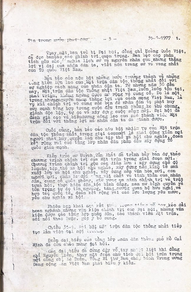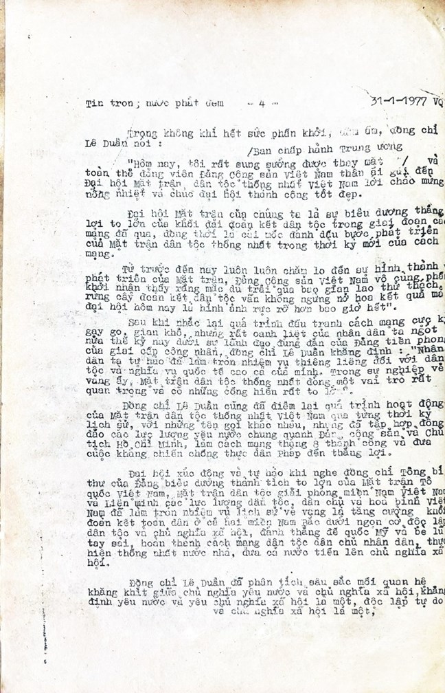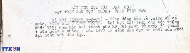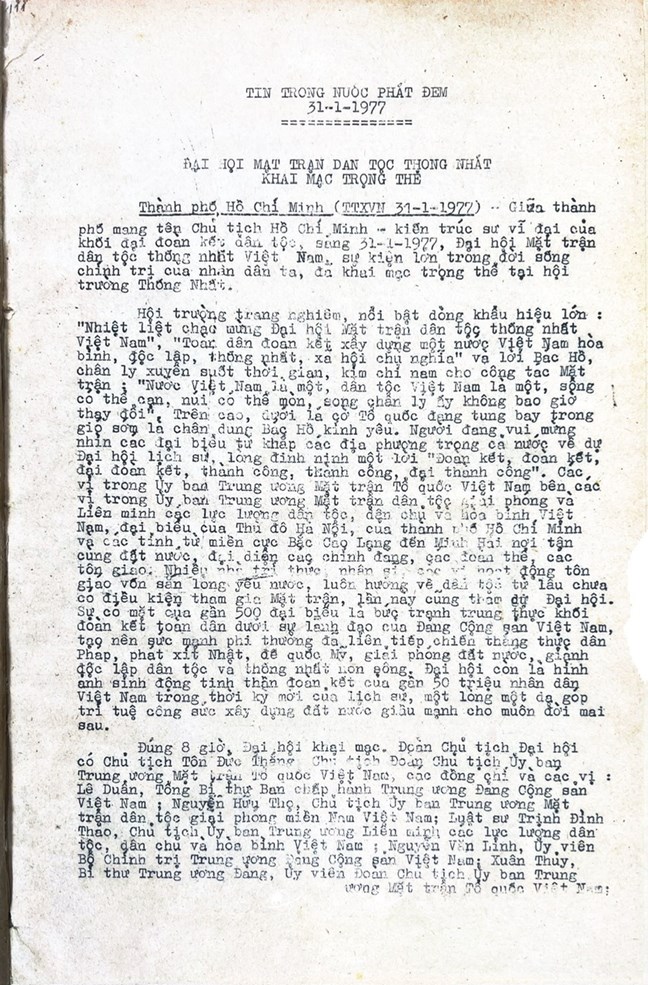 * Bài viết của Thông tấn xã Việt Nam (số 031-TTX), ngày 31/01/1977 về phiên khai mạc trọng thể Đại hội MTTQ Việt Nam lần thứ nhất