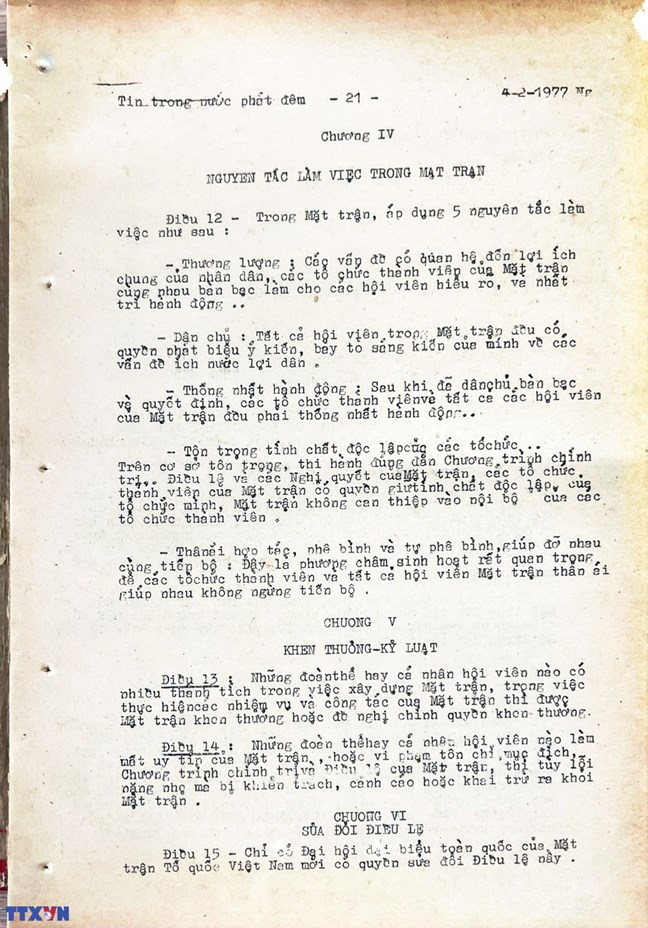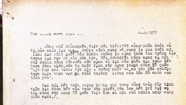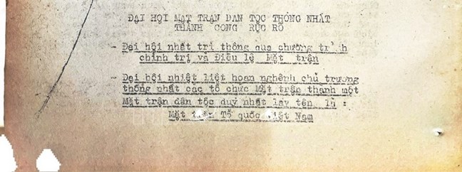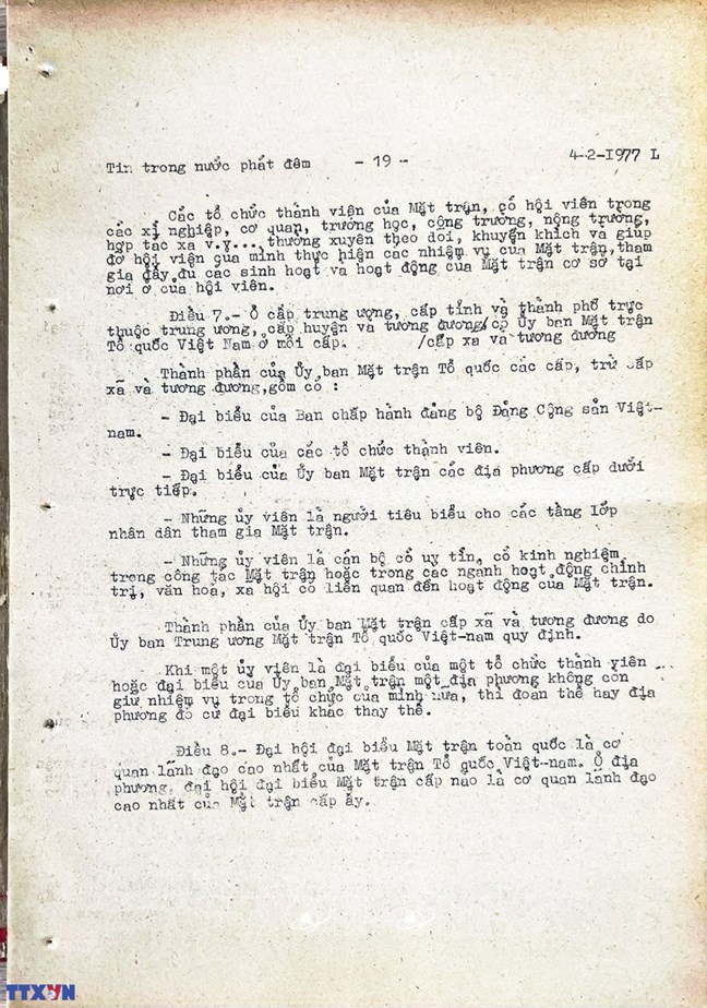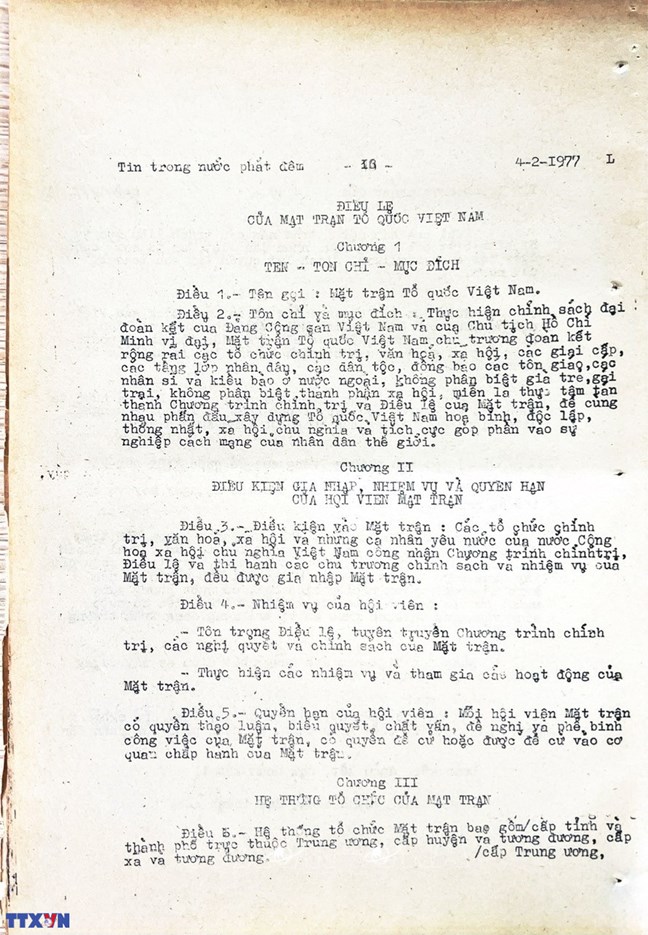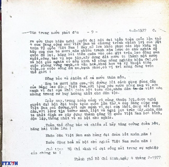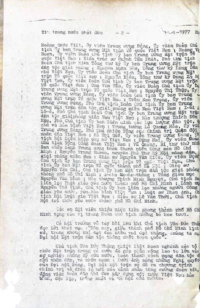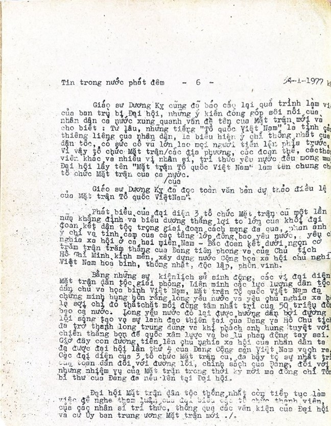 * Bài viết của Thông tấn xã Việt Nam (số 031-TTX), ngày 31/01/1977 về phiên khai mạc trọng thể Đại hội MTTQ Việt Nam lần thứ nhất