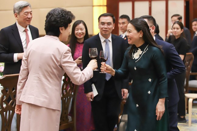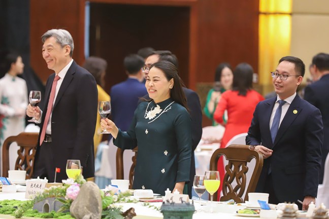 | Phó Chủ tịch - Tổng Thư ký Uỷ ban Trung ương Mặt trận Tổ quốc Việt Nam Nguyễn Thị Thu Hà và Phó Chủ tịch Chính hiệp toàn quốc Trung Quốc Hàm Huy cùng các đại biểu tại tiệc chiêu đãi |