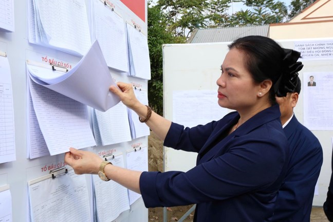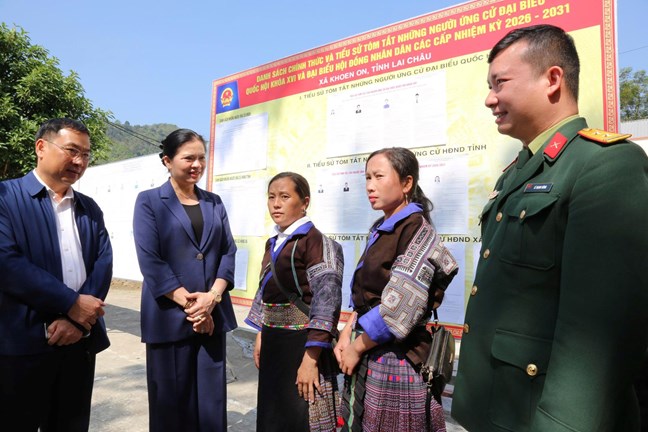 | Phó Chủ tịch - Tổng Thư ký Ủy ban Trung ương MTTQ Việt Nam Hà Thị Nga kiểm tra danh sách niêm yết của các đại biểu ứng cử Quốc hội khóa XVI và HĐND các cấp, nhiệm kỳ 2026 – 2031 tại xã Khoen On. |