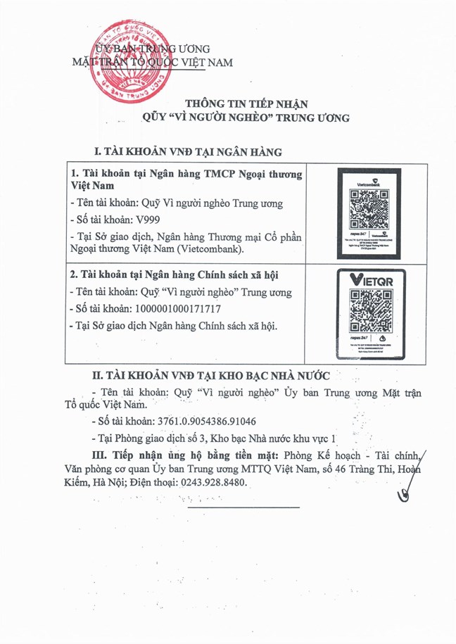 Để tiếp tục đồng hành cùng Ban Cứu trợ Trung ương - Ủy ban Trung ương Mặt trận Tổ quốc Việt Nam trong thực hiện công tác giảm nghèo bền vững, trân trọng đề nghị các đơn vị, tổ chức, cá nhân trong và ngoài nước tiếp tục ủng hộ về tài khoản Quỹ “Vì người nghèo” Trung ương để giúp đỡ người nghèo, hộ nghèo, hộ cận nghèo, người có hoàn cảnh đặc biệt khó khăn và cộng đồng nghèo trong thời gian tới để hỗ trợ phát triển sản xuất; hỗ trợ các em học sinh yên tâm đến trường; hỗ trợ hộ nghèo chữa bệnh nặng, hiểm nghèo; hỗ trợ xây dựng các công trình thiết yếu phục vụ cộng đồng…