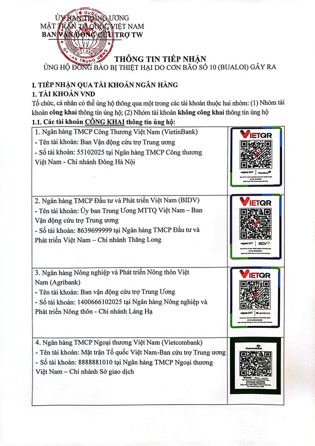 (Mặt trận) - Nhằm kịp thời huy động nguồn lực hỗ trợ đồng bào các địa phương bị thiệt hại và hưởng ứng Lễ phát động ủng hộ đồng bào bị thiệt hại do cơn bão số 10 gây ra, Ban Cứu trợ Trung ương - Ủy ban Trung ương Mặt trận Tổ quốc Việt Nam thông báo số tài khoản và đầu mối tiếp nhận ủng hộ như sau: