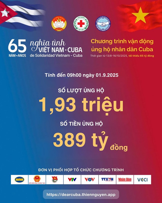 Ngay sau Lễ phát động cấp quốc gia ngày 13/8/2025 tại Hà Nội, Chương trình vận động ủng hộ nhân dân Cuba “65 năm nghĩa tình Việt Nam - Cuba” đã nhanh chóng nhận được sự hưởng ứng sâu rộng từ các tầng lớp nhân dân. Thông qua các kênh vận động trực tuyến, chương trình đạt được mục tiêu vận động tối thiểu 65 tỷ đồng chỉ trong vòng 30 giờ.