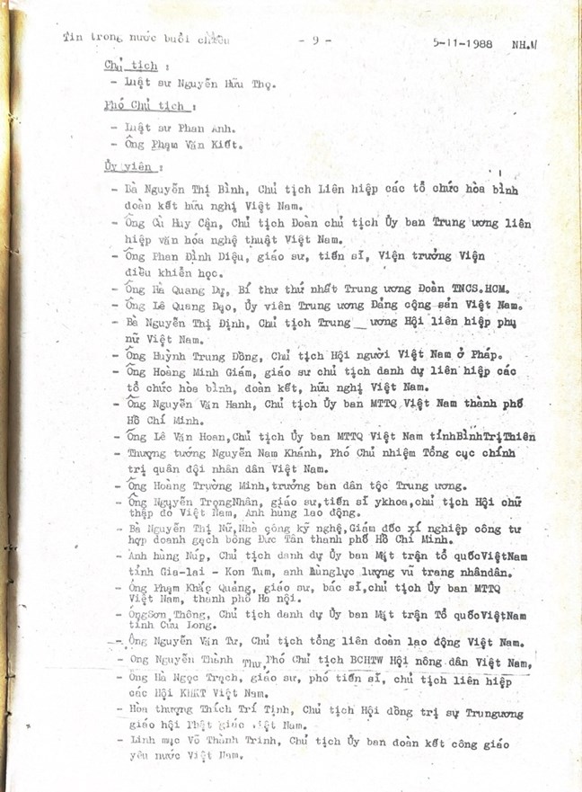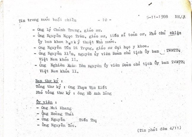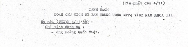 * Bài viết của Thông tấn xã Việt Nam (số 310-TTX), ngày 05/11/1988 về Danh sách Đoàn Chủ tịch Ủy ban Trung ương Mặt trận Tổ quốc Việt Nam khóa III