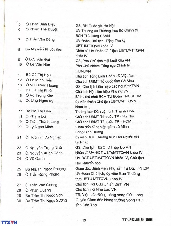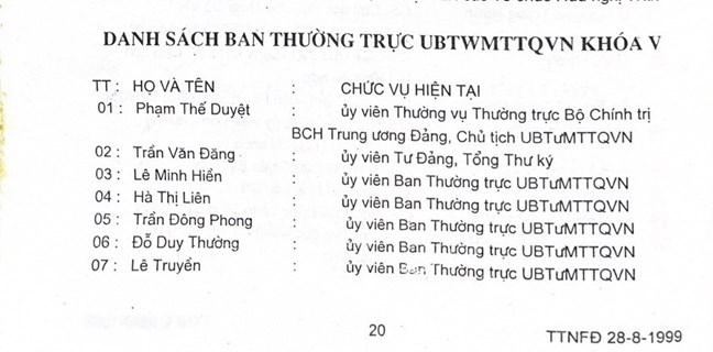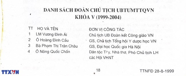 * Bài viết của Thông tấn xã Việt Nam (số 240 - TTX), ngày 28/08/1999 về Danh sách Ban Thường trực Ủy ban Trung ương Mặt trận Tổ quốc Việt Nam khóa V