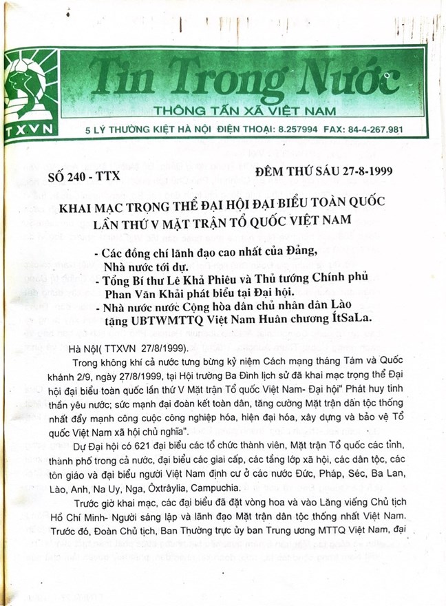 * Bài viết của Thông tấn xã Việt Nam (số 240-TTX), ngày 28/08/1999 về Nghị quyết Đại hội đại biểu toàn quốc lần thứ V Mặt trận Tổ quốc Việt Nam