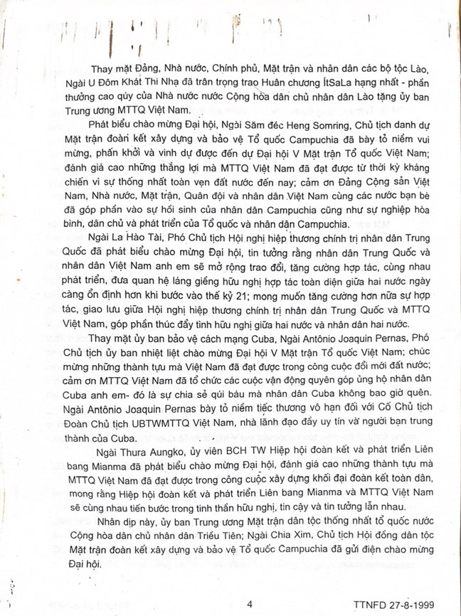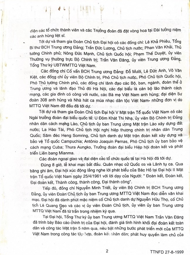 * Bài viết của Thông tấn xã Việt Nam (số 240-TTX), ngày 27/08/1999 về Phiên Khai mạc trọng thể Đại hội đại biểu toàn quốc lần thứ V Mặt trận Tổ quốc Việt Nam