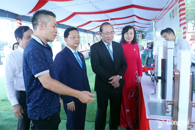 | Đồng chí Hoàng Công Thủy, Phó Chủ tịch Ủy ban Trung ương MTTQ Việt Nam và đồng chí Huỳnh Thị Hằng, Phó Bí thư Tỉnh ủy, Chủ tịch Ủy ban MTTQ Việt Nam tỉnh Đồng Nai tham quan sản phẩm trưng bày tại các gian hàng bên lề đại hội. Ảnh: Huy Anh |