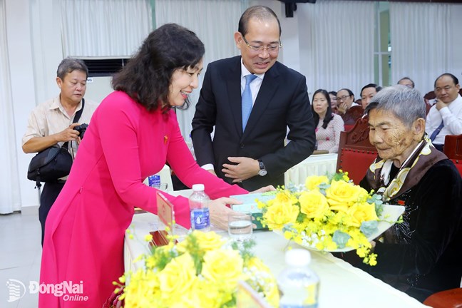| Ông Hoàng Công Thủy, Phó Chủ tịch Ủy ban Trung ương MTTQ Việt Nam và bà Huỳnh Thị Hằng, Phó Bí thư Tỉnh ủy, Chủ tịch Ủy ban MTTQ Việt Nam tỉnh Đồng Nai tặng hoa tri ân Mẹ Việt Nam anh hùng tại đại hội. Ảnh: Huy Anh |
