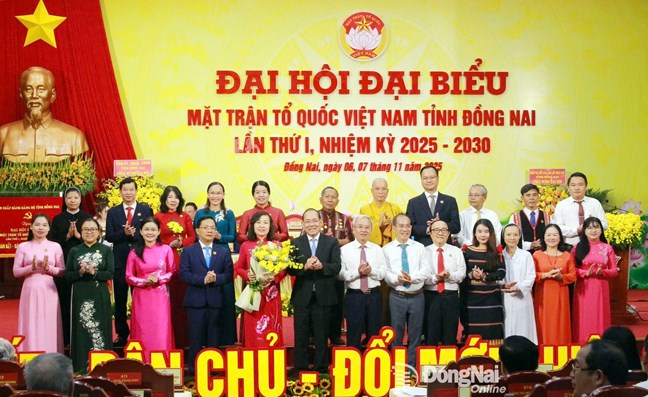 | Các đại biểu được đại hội hiệp thương vào Ủy ban MTTQ Việt Nam tỉnh Đồng Nai lần thứ I, nhiệm kỳ 2025-2030 ra mắt nhận nhiệm vụ. Ảnh: Huy Anh |