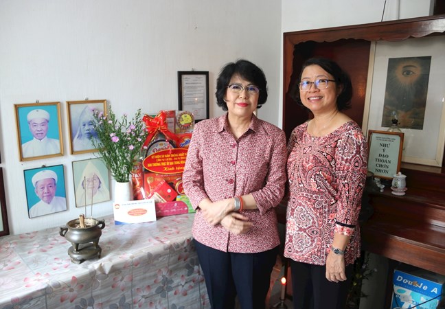 | Phó Chủ tịch Tô Thị Bích Châu cùng người thân của ông Đinh Văn Đệ - Đạo trưởng Cơ quan phổ thông giáo lý Đại đạo Cao đài bên bàn thờ ông (Ảnh: Q.Định). |