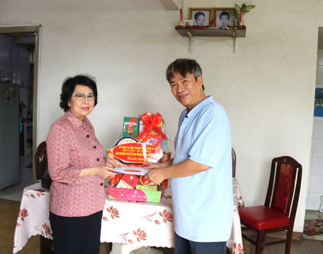 | Phó Chủ tịch Tô Thị Bích Châu trao quà đến đại diện gia đình Liệt sĩ, nhà thơ Trần Quang Long (Ảnh Q.Định). |