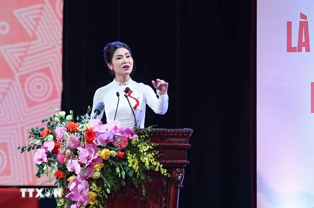 | Ca sỹ Nguyễn Thị Ngọc Hà (Hà Myo) trình diễn và phát biểu tại sự kiện. (Ảnh: Thanh Tùng/TTXN) |