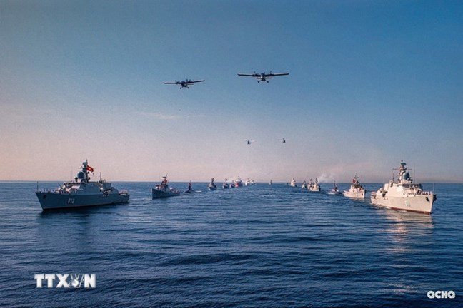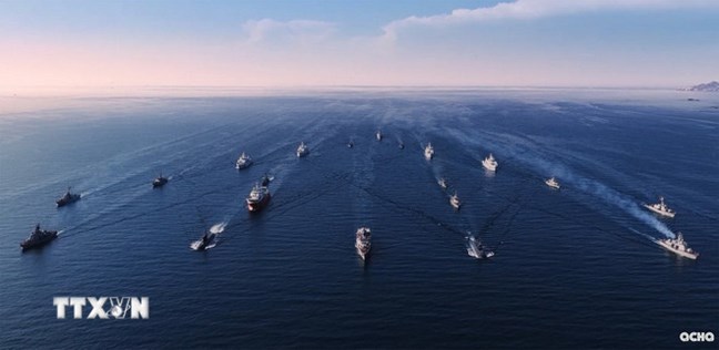 | Tàu chỉ huy duyệt biên đội tàu và máy bay tham gia diễu binh trên biển. (Ảnh: Quân chủng Hải quân/TTXVN phát) |