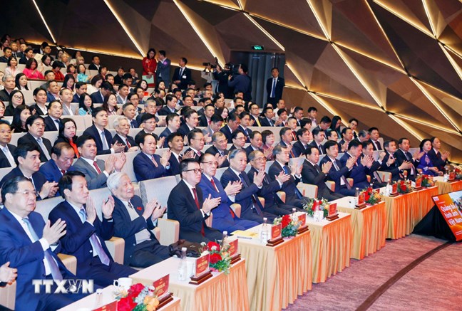 | Tổng Bí thư Tô Lâm và các đại biểu tham dự Lễ kỷ niệm. Ảnh: Thống Nhất/TTXVN |
