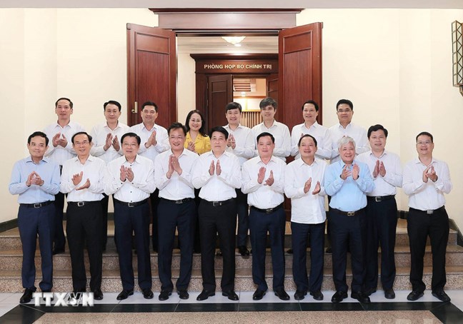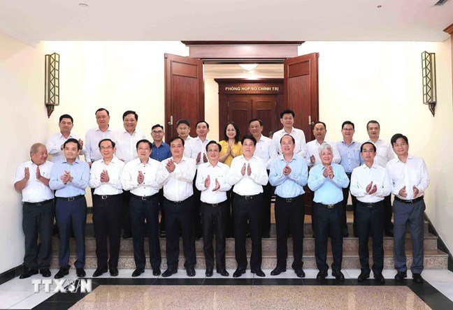 | Chủ tịch nước Lương Cường với Ban Thường vụ Tỉnh ủy Hưng Yên. Ảnh: An Đăng/TTXVN |