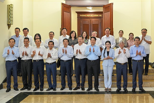 | Các đồng chí trong Tổ Công tác số 4 với Ban Thường vụ Tỉnh ủy Vĩnh Long. (Ảnh: DUY LINH) |