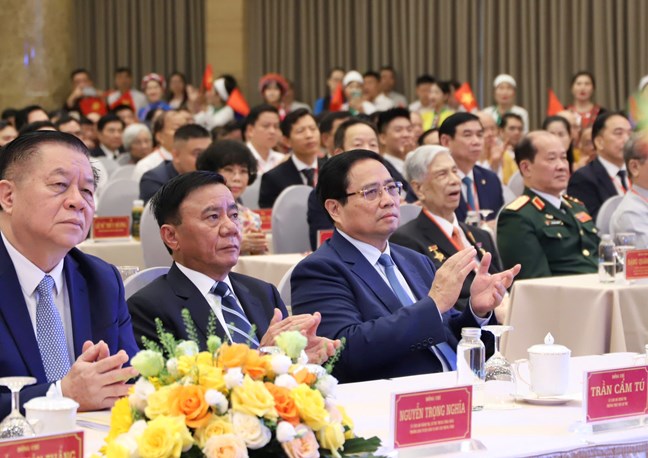 | Chủ tịch nước Lương Cường và Thủ tướng Phạm Minh Chính cùng các đồng chí lãnh đạo, nguyên lãnh đạo Đảng, Nhà nước dự hội nghị. Ảnh: Quang Vinh |
