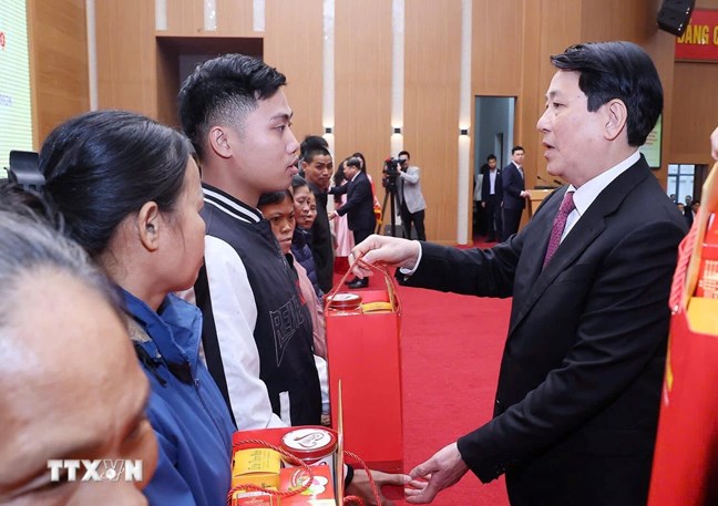 | Chủ tịch nước Lương Cường tới thăm, động viên và chúc Tết Đảng bộ, chính quyền, các hộ nghèo, gia đình chính sách, công nhân lao động có hoàn cảnh khó khăn. Ảnh: TTXVN |