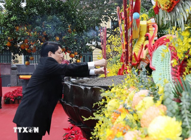 (Mặt trận) - Sáng 8/2 (tức ngày 20 tháng chạp), Chủ tịch nước Lương Cường và Phu nhân cùng đại diện lãnh đạo bộ, ban, ngành Trung ương, thành phố Hà Nội và 100 đại biểu kiều bào tiêu biểu thực hiện nghi lễ dâng hương tại Tượng đài vua Lý Thái Tổ và đền Ngọc Sơn.