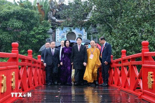 Chủ tịch nước Lương Cường cùng đại biểu kiều bào dâng hương tại Tượng đài Lý Thái Tổ và đền Ngọc Sơn