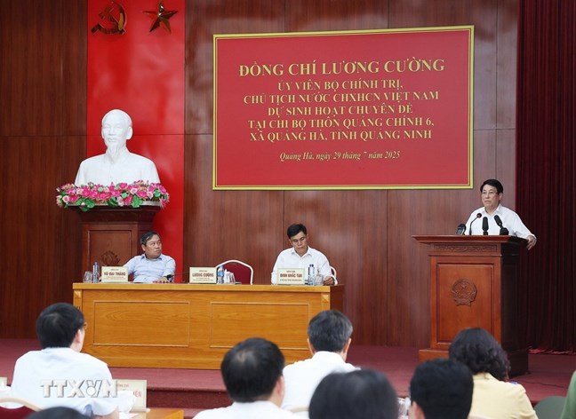 | Chủ tịch nước Lương Cường phát biểu tại sinh hoạt chuyên đề của Chi bộ thôn Quảng Chính 6, xã Quảng Hà. Ảnh: Lâm Khánh/ TTXVN |