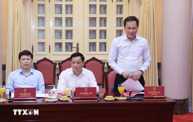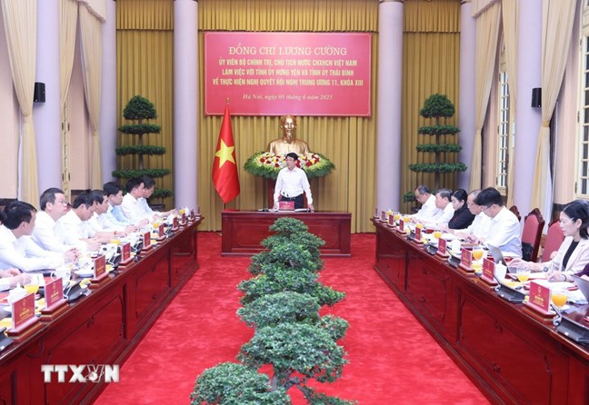 | Chủ tịch nước Lương Cường làm việc với Tỉnh ủy Hưng Yên và Tỉnh ủy Thái Bình về việc thực hiện Nghị quyết Hội nghị Trung ương 11, khóa XIII. Ảnh: Lâm Khánh/TTXVN |