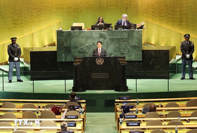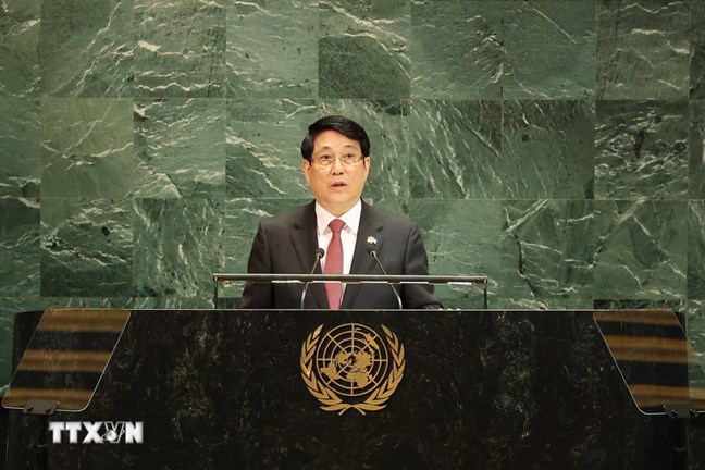 | Chủ tịch nước Lương Cường phát biểu tại Phiên Thảo luận chung cấp cao Đại hội đồng Liên hợp quốc Khoá 80. Ảnh: Lâm Khánh/TTXVN |