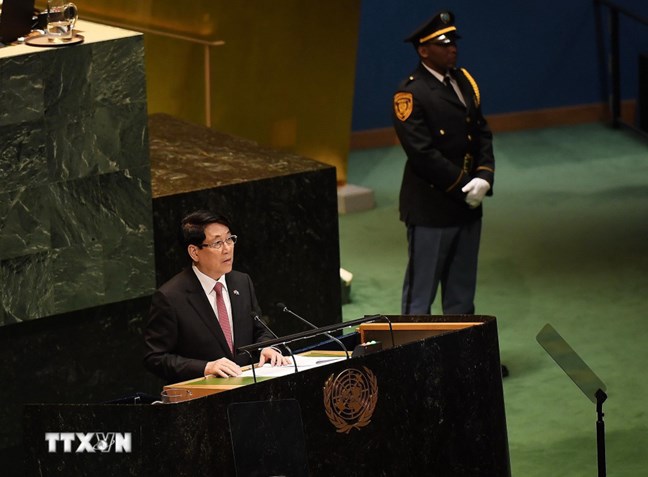 Khẳng định hòa bình vừa là mục tiêu, vừa là điều kiện tiên quyết cho xây dựng tương lai ổn định, công bằng, dân chủ và phát triển thịnh vượng, Chủ tịch nước kêu gọi các nước tuân thủ luật pháp quốc tế và Hiến chương LHQ, tôn trọng độc lập chủ quyền, toàn vẹn lãnh thổ, không can thiệp vào công việc nội bộ, không sử dụng vũ lực hay đe dọa sử dụng vũ lực, giải quyết các tranh chấp bằng biện pháp hòa bình.