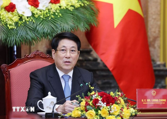 Chủ tịch nước Lương Cường đề nghị Ban Thanh niên Đảng Dân chủ tự do Nhật Bản nỗ lực thúc đẩy các chuyến thăm, tiếp xúc giữa Lãnh đạo cấp cao, các bộ, ngành, nghị sỹ Quốc hội, giao lưu giữa các địa phương hai nước Việt Nam-Nhật Bản; Nhật Bản hỗ trợ Việt Nam thực hiện công nghiệp hóa, hiện đại hóa đất nước, thực hiện các mục tiêu phát triển, hỗ trợ doanh nghiệp Việt Nam tham gia sâu rộng hơn vào chuỗi cung ứng của Nhật Bản, thúc đẩy hợp tác trong các lĩnh vực AI, lượng tử, bán dẫn, gắn kết nguồn nhân lực đặc biệt là nhân lực chất lượng cao.